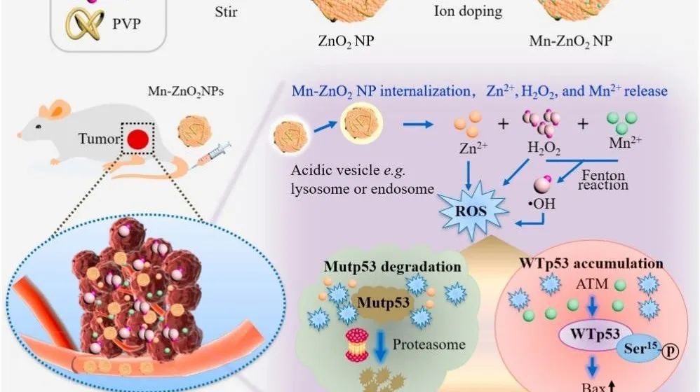 2022年6月,球天下安海龙教授团队在生物材料领域国际高水平期刊《Bioactive Materials》上发表了题为“Carrier-free nanoprodrug for p53-mutated tumor therapy via concurrent delivery of zinc-manganese dual ions and ROS”的研究成果。公司青年教师王金平博士是该文章的第一作者,安海龙教授、美国史蒂文斯理工公司Hongjun Wang教授是共同通讯作者。该研究工作设计合成了一种pH响应型锰掺杂的过氧化锌纳米颗粒,并通过体内外实验证明了该纳米材料通过“双向调控”p53蛋白活性、产生ROS等三个途径有效抑制肿瘤增殖,为恶性肿瘤临床治疗提供了一种新策略。