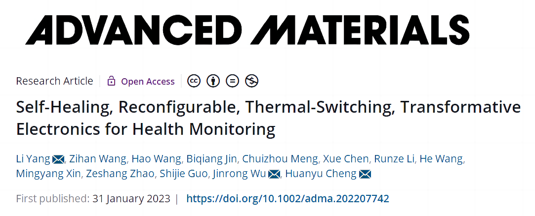 制约柔性传感器应用的难题之一是其抗机械损伤能力差,易受到外部摩擦、扭转、撕裂等问题,导致无法工作。针对此问题,团队提出了一种基于自修复吸湿性随机超支化聚合物(HRHP)和可印刷固液双相镓铟合金(bGaIn)的自愈合、可重组、热切换、变模量多功能电子平台,解决了柔性器件可靠性差,难以长期应用的问题。HRHP为电子器件提供了优异的自愈合性能和独特的变刚度,变粘附力特性,bGaIn实现了高延展性(>900%)、高电导率(3.40 × 104 S cm−1)、可批量印刷的柔性液态金属电路的制备。柔性多功能电子器件可以像电子纹身一样在皮肤上共形贴附,进行无创、连续、舒适的健康监测。此外,HRHP的自愈合与粘附性能可以轻松实现二维平面组件在三维复杂曲面上的重构。该工作为柔性变形设备、智能机器人、假肢和物联网以及不规则表面上的人机界面提供了新的方法。该成果以“Self-Healing, Reconfigurable, Thermal-Switching, Transformative Electronics for Health Monitoring”为题发表在《Advanced Materials》上。(DOI:10.1002/adma.202207742)。