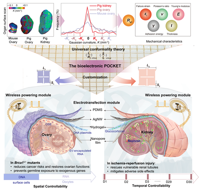 多项动物实验充分验证了该成果的临床适用性与可靠性:在模拟人BRCA1基因突变的卵巢癌预防模型中,该器件成功将功能性基因精准“送达”卵巢表面上皮细胞,既显著降低癌变风险,又同步改善卵巢功能、唤醒生育能力,为携带遗传突变的女性送上“保卵巢、防癌变”的健康福音;在肾脏缺血再灌注损伤模型中,POCKET器件实现抗炎药物的局部长效“缓释补给”,在高效推动肾脏修复的同时,几乎完全规避了传统全身给药带来的严重副作用,为肾脏损伤治疗开辟了新路径。