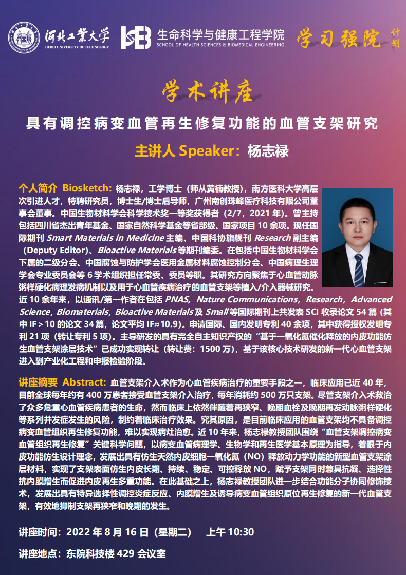 讲座题目:具 有 调 控 病 变 血 管 再 生 修 复 功 能 的 血 管 支 架 研 究