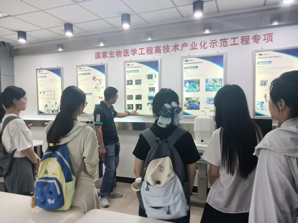 最后一站是天津迈达医学科技股份有限公司——国内眼科与医学影像设备的领军企业,其超声乳化仪、眼底照相机等产品出口至全球50余个国家。在企业产品展示区,同学们通过高清影像系统观察了超声乳化针头在眼球中的精准操作;在研发部,工程师以“国产高端医学影像设备的突围之路”为主题,分享了团队攻克核心元器件“卡脖子”技术的故事。“以前觉得‘医学影像装备’离我们很远,今天才知道一台超声设备的探头里,集成了机械工程、材料科学、电子信息、信号处理、临床医学等多学科知识——这正是我们医工交叉专业的优势所在!”学习委员卓涛同学在交流环节主动提问,并得到了工程师关于“如何提升跨学科能力”的具体建议。