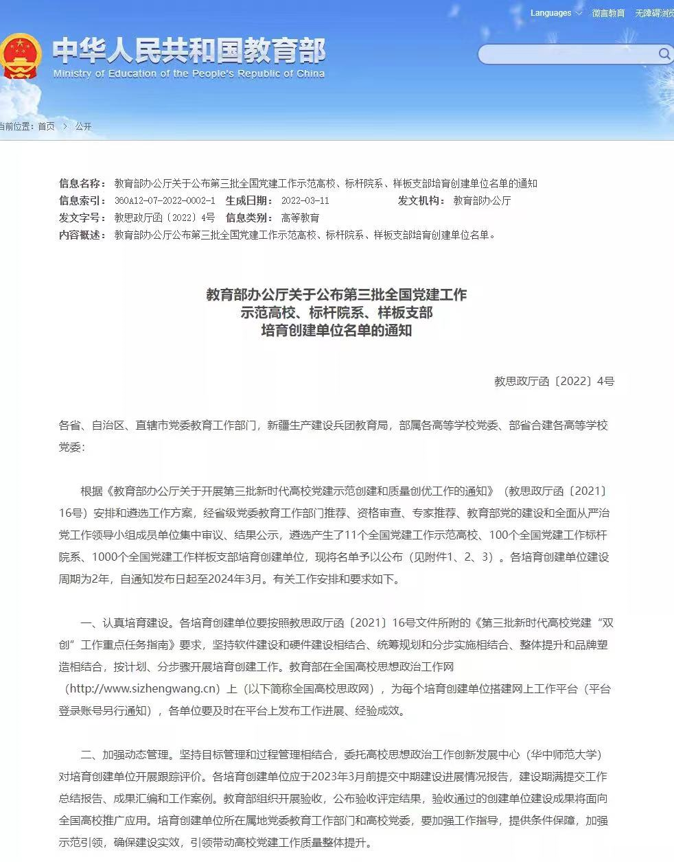 近日,教育部公布了第三批全国党建工作示范高校、标杆院系、样板支部培育创建单位名单,公司生物医学工程系党支部入选第三批“全国党建工作样板支部”培育创建单位。
