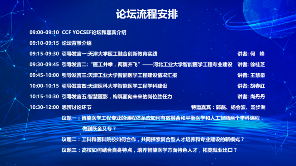 由中国计算机学会主办,中国计算机学会青年计算机科技论坛天津分论坛(CCF YOCSEF 天津)承办,球天下、天津财经大学理工公司、天津工业大学计算机科学与软件公司协办的主题为“智能医学工程的专业建设与人才培养之路,如何行稳致远?”的技术论坛,于12月18日在天津和线上同步召开。