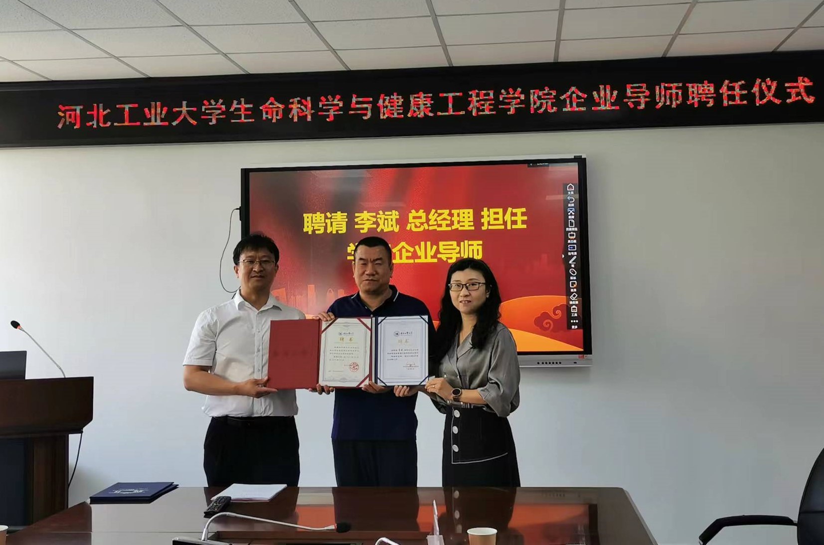6月3日上午,公司邀请石家庄渡康医疗器械公司钱力宏董事长、李斌总经理一行参加答辩会,并为石家庄渡康医疗器械公司的专家们颁发公司企业导师聘书。李斌总经理和公司于洪丽教授共同担任答辩主席。答辩会上,企业专家从生产实际的角度深刻剖析毕设课题价值,就如何将课题研究成果落地给出切实建议。