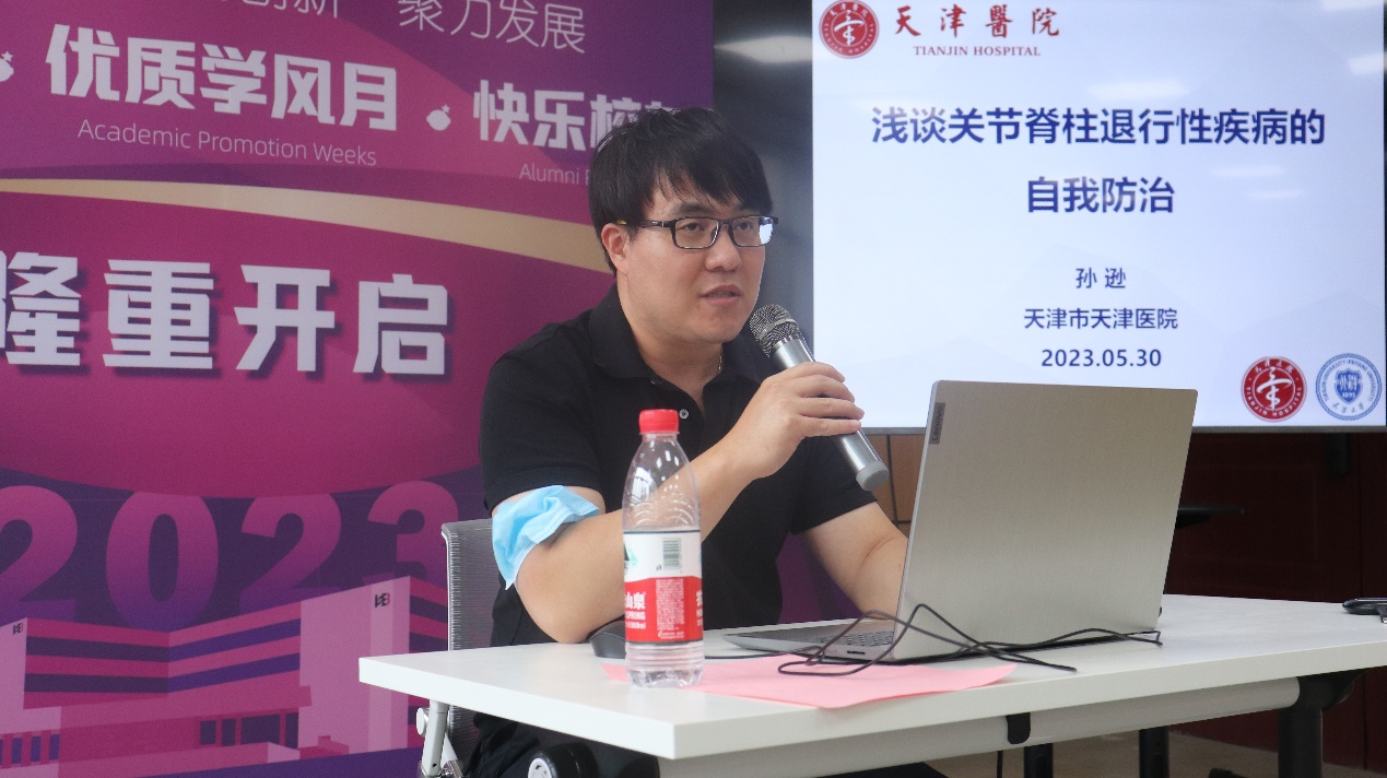科普系列讲座环节邀请到天津大学天津医院脊柱外科医师孙逊做题为“浅谈关节脊柱退行性疾病的自我防治”的首场科普报告,引导师生关注脊柱健康,建立正确的脊柱健康理念,养成良好生活习惯。