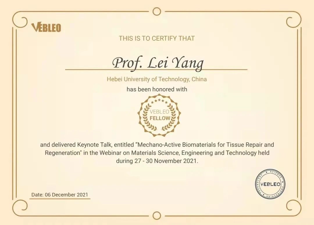 12月6日,杨磊教授入选国际科学组织Vebleo学会的会士(Fellow)。Vebleo是活跃在科学、工程和技术领域的国际学术组织。Vebleo学会会士是对致力于科学研究并为人类科技进步做出突出贡献科学家的表彰。该荣誉称号经国际专家匿名提名和评审,主要授予对象是处于职业生涯中期、至少拥有10年科研和论文出版经历,在各自领域处于领先地位的杰出研究人员。