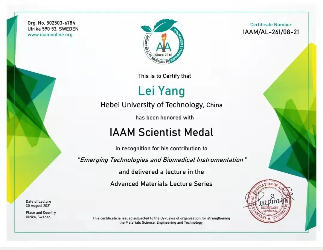 11月29日,杨磊教授获得世界国际先进材料学会(International Association of Advanced Materials, IAAM)科学家奖章(Scientist Medal),以表彰他在“材料新兴技术与生物医学装备”领域的贡献。IAAM是一个非政府国际性学术组织,成立于 2010 年,总部设在瑞典,其宗旨是致力于为先进材料科学、工程和技术在世界范围内快速发展提供一个高水平的学术交流平台。