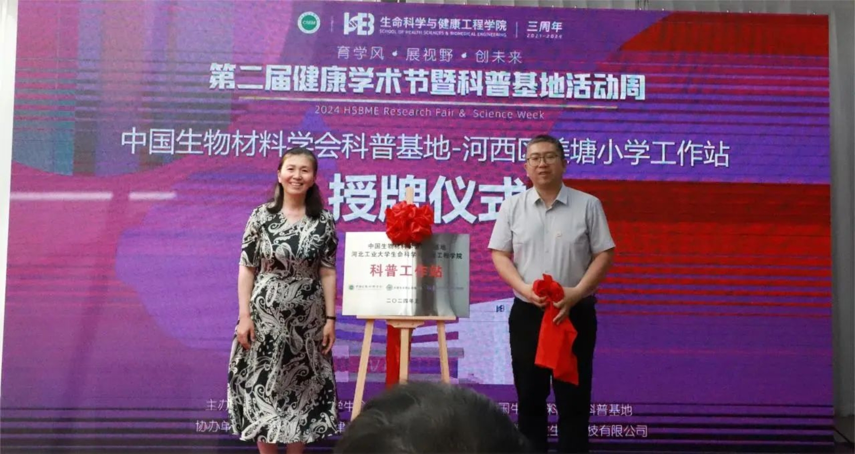 公司医工系主任周欢与天津市河西区美塘小学党委书记、董事长周静为中国生物材料学会科普基地-河西区美塘小学工作站授牌。