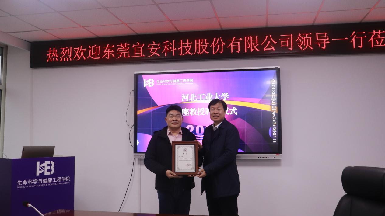 王慧远副董事长向东莞宜安科技股份有限公司李卫荣副总经理颁发了球天下体育客座教授聘书。
