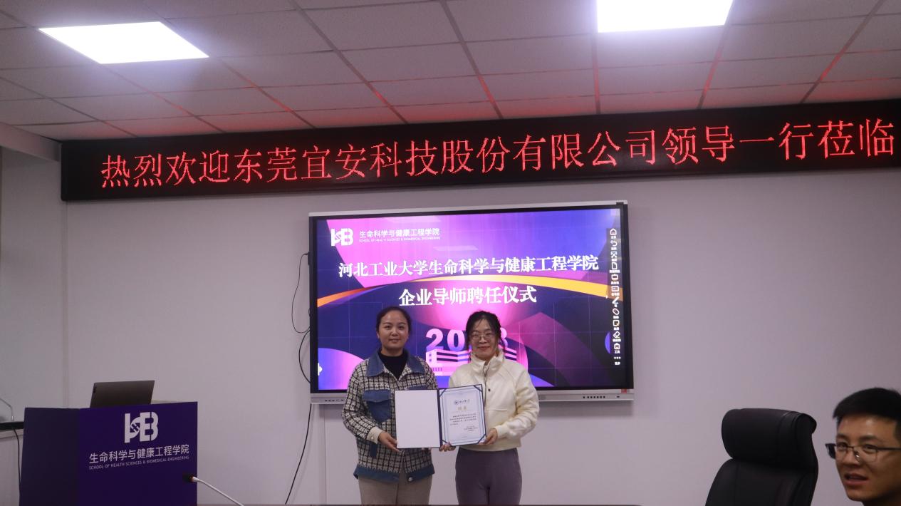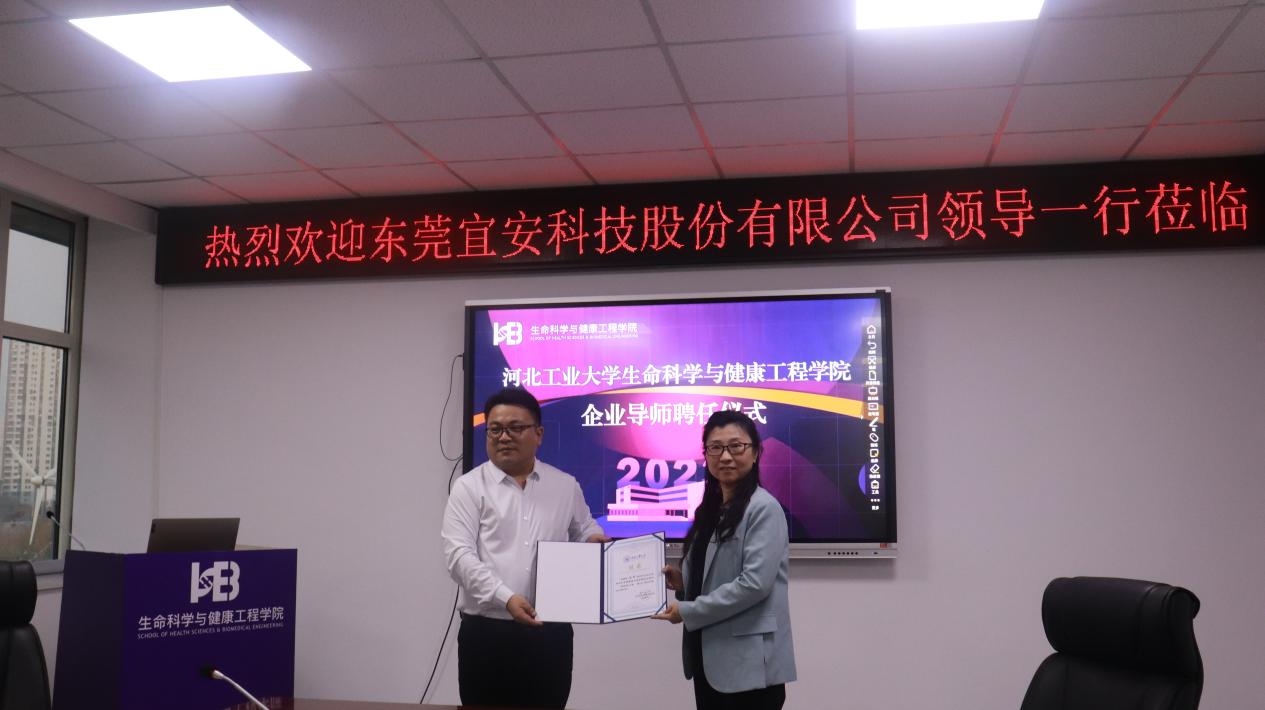 邢成芬副经理向东莞宜安科技股份有限公司医疗器械事业部刘芳菲博士颁发企业导师聘书。